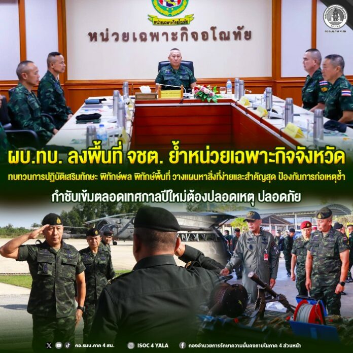 วันนี้ (30 ธันวาคม 2568) เวลา 14.30 น. พลเอก พนา แคล้วปลอดทุกข์ ผู้บัญชาการทหารบก / รองผู้อำนวยการรักษาความมั่นคงภายในราชอาณาจักร พร้อมคณะผู้บังคับบัญชาระดับสูงจากกองทัพบก ลงพื้นที่ติดตามการปฏิบัติงาน พร้อมมอบนโยบายการขับเคลื่อนแก้ไขปัญหาในห้วงสามเดือนถัดไป ให้มีประสิทธิภาพครอบคลุมทุกมิติ ณ หน่วยเฉพาะกิจปัตตานี ค่ายสมเด็จพระสุริโยทัย ตำบลบ่อทอง อำเภอหนองจิก จังหวัดปัตตานี โดยมี พลโท นรธิป โพยนอก แม่ทัพภาคที่ 4 / ผู้อำนวยการรักษาความมั่นคงภายในภาค 4 พร้อมผู้บังคับบัญชา และคณะฝ่ายอำนวยการของกองอำนวยการรักษาความมั่นคงภายในภาค 4 ส่วนหน้า รายงานสถานการณ์ และร่วมคณะฯ ติดตาม
