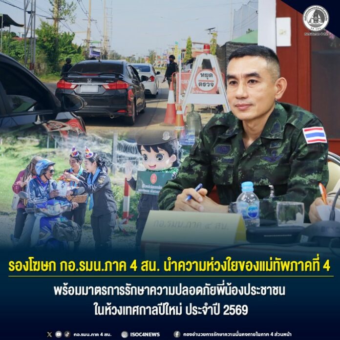 เมื่อวันที่ 30 ธันวาคม 2568 ณ ห้องแถลงข่าว ศูนย์ประชาสัมพันธ์ กองอำนวยการรักษาความมั่นคงภายในภาค 4 ส่วนหน้า พันเอก เอกวริทธิ์ ชอบชูผล รองโฆษกกองอำนวยการรักษาความมั่นคงภายในภาค 4 ส่วนหน้า เปิดเผยว่า พลโท นรธิป โพยนอก แม่ทัพภาคที่ 4 / ผู้อำนวยการรักษาความมั่นคงภายในภาค 4 มีความห่วงใยพี่น้องประชาชน ในห้วงของการเฉลิมฉลองเทศกาลปีใหม่ ประจำปี 2569 และได้มีมาตรการรักษาความปลอดภัยในพื้นที่จังหวัดชายแดนภาคใต้ เพื่อให้พี่น้องประชาชนที่เดินทางสัญจรไป-มา และเดินทางกลับภูมิลำเนา ตลอดจน นักท่องเที่ยว ที่เดินทางเข้ามาในพื้นที่จังหวัดชายแดนภาคใต้ ได้มีความปลอดภัย อุ่นใจ และมั่นใจ ในมาตรการดูแลความปลอดภัยของหน่วยงานความมั่นคง โดย กองอำนวยการรักษาความมั่นคงภายในภาค 4 ส่วนหน้า ได้เตรียมความพร้อมในการดูแลความปลอดภัยให้กับพี่น้องประชาชนอย่างเต็มกำลัง พร้อมทั้ง การดำเนินมาตรการเชิงรุกควบคู่กับมาตรการเชิงรับ
