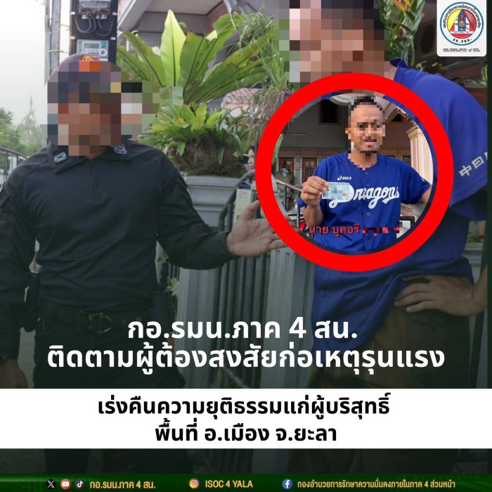 วันนี้ (วันที่ 31 ธันวาคม 2568) เวลาประมาณ 07.00 น. หน่วยปฏิบัติการพิเศษร่วมประจำจังหวัดยะลา ได้รวบรวมพยานหลักฐาน ข้อมูลอันเป็นประโยชน์จากพี่น้องประชาชน ตลอดจนหลักฐานทางนิติวิทยาศาสตร์ และสามารถเชื่องโยงถึงผู้ต้องสงสัย จึงบังคับใช้กฎหมายต่อ นายบูคอรี (สงวนนามสกุล) ณ บ้านพักในพื้นที่ หมู่ที่ 3 ตำบลสะเตงนอก อำเภอเมือง จังหวัดยะลา ซึ่งเป็นบุคคลต้องสงสัยเกี่ยวข้องกับเหตุรุนแรง ในพื้นที่อำเภอเมือง และพื้นที่อำเภอบันนังสตา จังหวัดยะลา