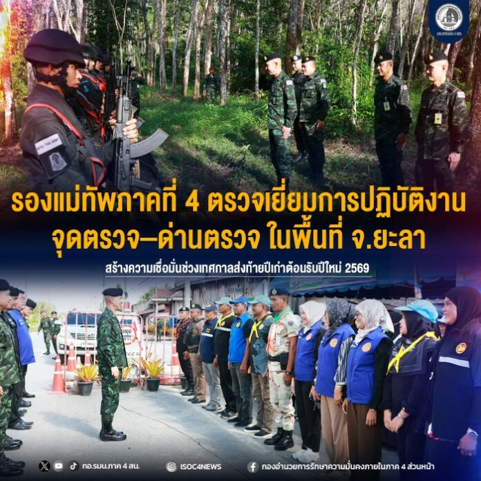 ในการนี้ รองแม่ทัพภาคที่ 4 และคณะฯ ได้เดินทางไปตรวจเยี่ยมจุดบริการประชาชน 3 ฝ่าย ด่านตรวจร่วมบาโงยซิแน ตำบลบาโงยซิแน อำเภอยะหา จังหวัดยะลา และติดตามการปฏิบัติงานของชุดคุ้มครองตำบลกาตอง โดยมีเจ้าหน้าที่ทั้ง 3 ฝ่ายปฏิบัติหน้าที่ร่วมกันอย่างเข้มแข็ง ทั้งในมิติการรักษาความปลอดภัย การอำนวยความสะดวก และการป้องกันเหตุในช่วงปีใหม่ โดยได้กำชับให้หน่วยเพิ่มความเข้มงวดในการปฏิบัติงาน ควบคู่ไปกับการให้บริการด้วยความสุภาพ เป็นมิตร และคำนึงถึงความปลอดภัยของประชาชนเป็นสำคัญ