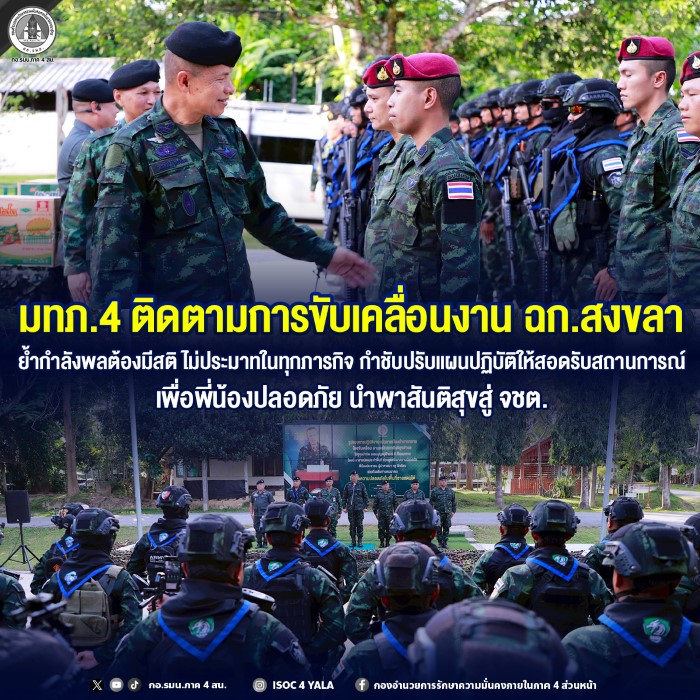 วันนี้ (3 มกราคม 2569) เวลา 15.30 น. ณ หน่วยเฉพาะกิจสงขลา 40 อำเภอสะบ้าย้อย จังหวัดสงขลา พลโท นรธิป โพยนอก แม่ทัพภาคที่ 4 และผู้อำนวยการรักษาความมั่นคงภายในภาค 4 ลงพื้นที่ตรวจเยี่ยมและมอบเครื่องอุปโภคบริโภคเพื่อส่งกำลังใจแก่ผู้ปฏิบัติงาน พร้อมติดตามการบูรณาการทำงานร่วมกับหน่วยงานที่เกี่ยวข้องในการดูแลความสงบเรียบร้อยในพื้นที่ โดยมีผู้บังคับบัญชา คณะฝ่ายอำนวยการ กองอำนวยการรักษาความมั่นคงภายในภาค 4 ส่วนหน้า ผู้บังคับหน่วยเฉพาะกิจสงขลา หัวหน้าส่วนราชการ และกำลังพลร่วมให้การต้อนรับและรายงานผลการปฏิบัติงาน