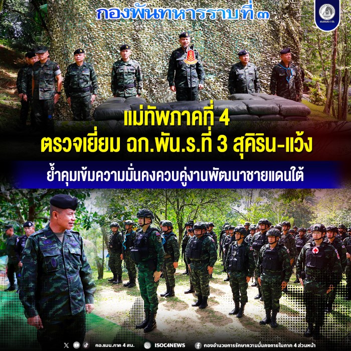 วันที่ 3 มกราคม 2569 พลโท นรธิป โพยนอก แม่ทัพภาคที่ 4 / ผู้อำนวยการรักษาความมั่นคงภายในภาค 4 พร้อมคณะผู้บังคับบัญชา ลงพื้นที่ตรวจเยี่ยมหน่วยเฉพาะกิจกองพันทหารราบที่ 3 (ฉก.พัน.ร.ที่ 3) ในพื้นที่อำเภอสุคิริน และอำเภอแว้ง จังหวัดนราธิวาส เพื่อประชุมติดตามผลการดำเนินงาน รับฟังรับปัญหาข้อขัดข้อง พร้อมมอบนโยบายและเยี่ยมสร้างขวัญกำลังใจแก่กำลังพลที่ปฏิบัติงานในพื้นที่