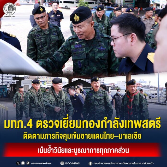 วันนี้ (4 มกราคม 2569) เวลา 08.30 น. พลโท นรธิป โพยนอก แม่ทัพภาคที่ 4 พร้อมคณะผู้บังคับบัญชา ลงพื้นที่จังหวัดสงขลา เพื่อตรวจเยี่ยมและติดตามภารกิจของกองกำลังเทพสตรี พร้อมประชุมรับฟังผลการดำเนินงานและปัญหาข้อขัดข้องต่าง ๆ รวมถึงมอบนโยบายและสร้างขวัญกำลังใจแก่กำลังพล ณ กองบัญชาการกองร้อยทหารราบที่ 5021 หน่วยเฉพาะกิจกรมทหารราบที่ 5 ตำบลสะเดา อำเภอสะเดา จังหวัดสงขลา โดยมี พลตรี อภินันท์ แจ่มแจ้ง ผู้บัญชาการกองกำลังเทพสตรี พร้อมด้วยผู้บังคับหน่วยและกำลังพลร่วมให้การต้อนรับ