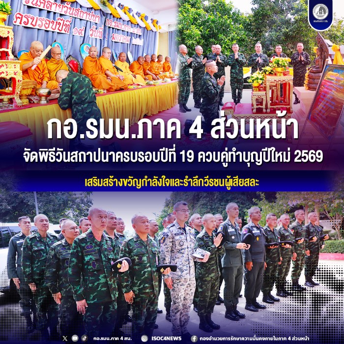 วันนี้ (5 มกราคม 2569) เวลา 09.30 น. พลโท นรธิป โพยนอก แม่ทัพภาคที่ 4 / ผู้อำนวยการรักษาความมั่นคงภายในภาค 4 เป็นประธานในพิธีทำบุญวันคล้ายวันสถาปนา กองอำนวยการรักษาความมั่นคงภายในภาค 4 ส่วนหน้า ครบรอบปีที่ 19 ซึ่งก่อตั้งมาตั้งแต่วันที่ 1 มกราคม 2549 ตามมติคณะรัฐมนตรีเพื่อปฏิบัติหน้าที่ในการแก้ไขปัญหาการก่อความไม่สงบในพื้นที่จังหวัดชายแดนภาคใต้ พร้อมกันนี้ยังได้จัดให้มีพิธีทำบุญเนื่องในวาระขึ้นปีใหม่ พุทธศักราช 2569 และพิธีบำเพ็ญกุศลอุทิศให้แก่กำลังพลผู้เสียชีวิตจากการปฏิบัติหน้าที่ในพื้นที่จังหวัดชายแดนภาคใต้ โดยมีผู้บังคับบัญชาระดับสูง และกำลังพลจากหน่วยขึ้นตรงเข้าร่วมพิธีอย่างพร้อมเพรียง