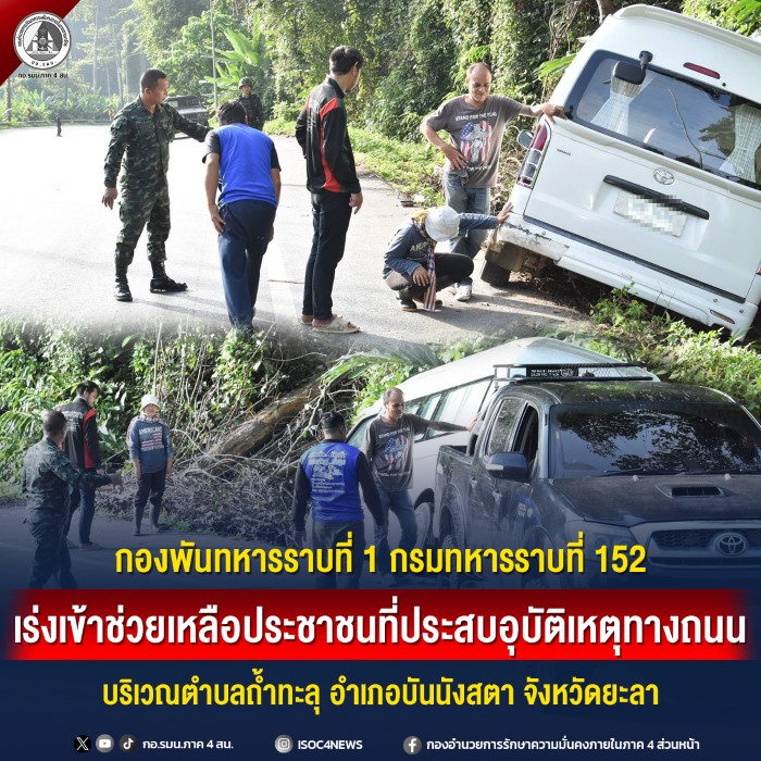 เมื่อวันที่ 6 มกราคม 2569 เวลา 08.15 น. กองพันทหารราบที่ 1 กรมทหารราบที่ 152 จัดกำลังพลเข้าช่วยเหลือประชาชนที่ประสบอุบัติเหตุทางถนนอย่างเร่งด่วน ณ บริเวณทางโค้งหน้ากองพันทหารราบที่ 1 กรมทหารราบที่ 152 บน ถนนสาย 410 (ยะลา – เบตง) ตำบลถ้ำทะลุ อำเภอบันนังสตา จังหวัดยะลา