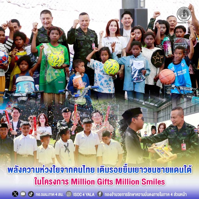 วันนี้ (7 มกราคม 2569) เวลา 10.00 น. พลโท นรธิป โพยนอก แม่ทัพภาคที่ 4 / ผู้อำนวยการรักษาความมั่นคงภายในภาค 4 เป็นประธานในพิธีรับมอบของขวัญจากกลุ่มเซ็นทรัล ภายใต้กิจกรรม Million Gifts Million Smiles “ของขวัญจากใจ เพื่อรอยยิ้มของทุกคน” ปีที่ 16 เพื่อส่งต่อความสุขและกำลังใจให้แก่เด็กและเยาวชนในพื้นที่จังหวัดชายแดนภาคใต้ เนื่องในโอกาสวันเด็กแห่งชาติ โดยมีผู้บังคับบัญชาจากหน่วยเฉพาะกิจยะลา, ปัตตานี, นราธิวาส, สงขลา, หน่วยเฉพาะกิจสันติสุข และกรมทหารราบที่ 152 ตลอดจนน้องๆ เยาวชน และผู้ปกครองเข้าร่วมพิธีอย่างพร้อมเพรียง