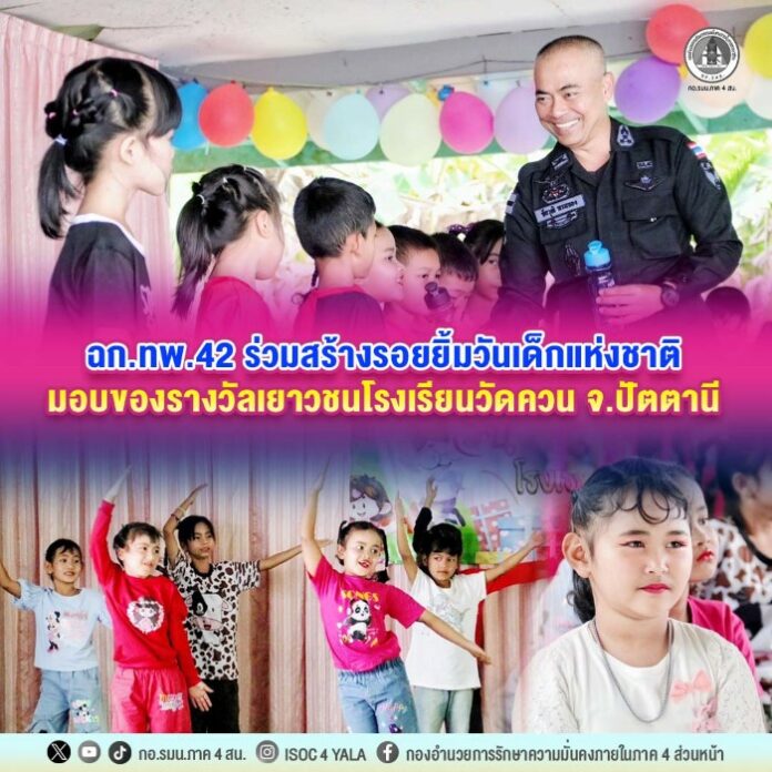 (ปัตตานี – 9 มกราคม 2569) บรรยากาศแห่งความสุขต้อนรับวันเด็กแห่งชาติเริ่มต้นขึ้นอย่างอบอุ่น เมื่อเวลา 09.00 น. ที่ผ่านมา ณ โรงเรียนวัดควน ตำบลควน อำเภอปะนาเระ จังหวัดปัตตานี พันเอก ชัยวุฒิ พรมทอง ผู้บังคับหน่วยเฉพาะกิจกรมทหารพรานที่ 42 นำคณะทำงาน ประกอบด้วย หัวหน้าฝ่ายกิจการพลเรือน, ชุดปฏิบัติการกิจการพลเรือน และ “หมวดทหารพรานหญิง” ลงพื้นที่เพื่อเข้าร่วมกิจกรรมงานวันเด็กแห่งชาติ ประจำปี 2569 ท่ามกลางการต้อนรับอย่างสดใสจากคณะครูและน้องๆ นักเรียน