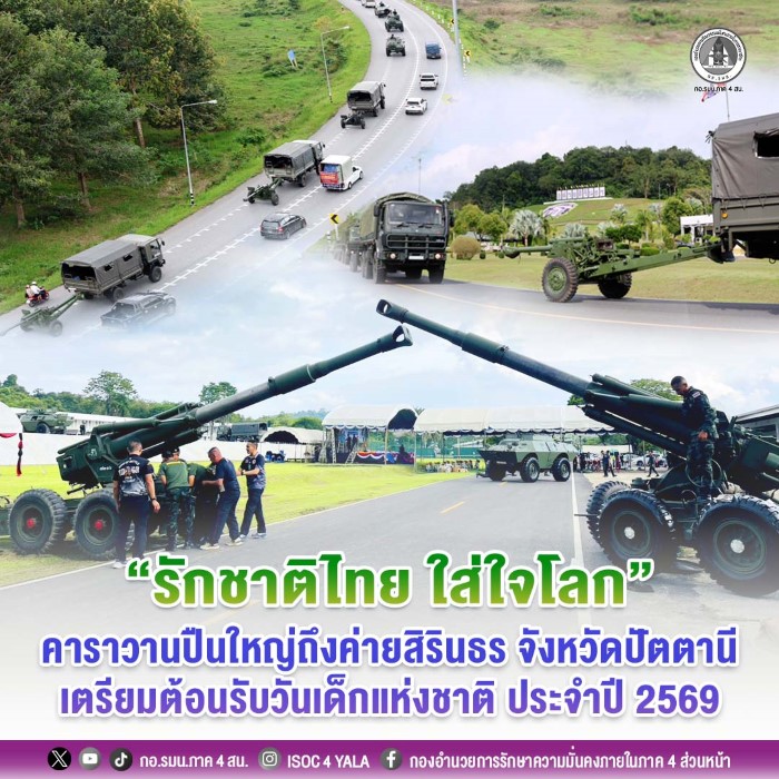 ล่าสุด ในวันนี้ เวลา 15.00 น. คาราวานปืนใหญ่ ซึ่งเป็นหนึ่งในยุทโธปกรณ์สำคัญ ได้เดินทางถึงค่ายสิรินธร จังหวัดปัตตานี เพื่อเตรียมจัดแสดงให้เด็ก ๆ และผู้ปกครองได้สัมผัสความยิ่งใหญ่ของยุทโธปกรณ์ที่มีภารกิจปกป้องอธิปไตยของชาติ โดยประกอบด้วยปืนใหญ่หลากหลายขนาดและรูปแบบ อาทิ ปืนใหญ่เบากระสุนวิถีโค้ง ขนาด 105 มิลลิเมตร แบบ M101A1 จากกองพันทหารปืนใหญ่ที่ 5 กรมทหารปืนใหญ่ที่ 5 ค่ายพระปกเกล้า จังหวัดสงขลา และ ปืนใหญ่หนักกระสุนวิถีราบ ขนาด 155 มิลลิเมตร แบบ M71 จากกองพันทหารปืนใหญ่ที่ 105 กรมทหารปืนใหญ่ที่ 5 ค่ายวชิราวุธ จังหวัดนครศรีธรรมราช