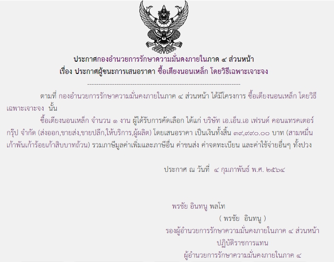 จัดซื้อ จัดจ้างประกาศผู้ชนะการเสนอราคา ประกาศผู้ชนะการเสนอราคา ซื้อเตียงนอนเหล็ก โดยวิธีเฉพาะเจาะจง (39,990.00) February 7, 2021 1098 Share Facebook Twitter Google+ Telegram LINE สกบ.กอ.รมน.ภาค 4 สน.