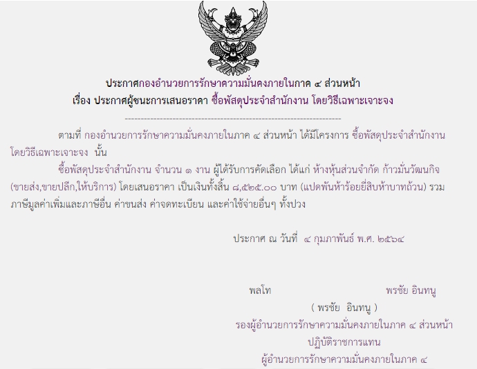 ประกาศผู้ชนะการเสนอราคา ซื้อพัสดุประจำสำนักงาน โดยวิธีเฉพาะเจาะจง (8,525.00)