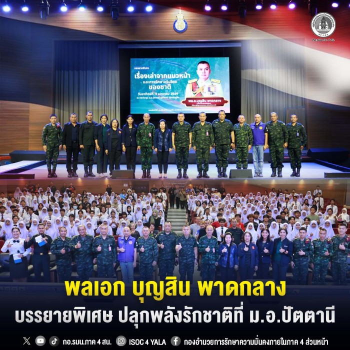 วันนี้ (11 มกราคม 2569) เวลา 14.00 น. ณ มหาวิทยาลัยสงขลานครินทร์ วิทยาเขตปัตตานี อำเภอเมือง จังหวัดปัตตานี พลเอก บุญสิน พาดกลาง นายทหารราชองครักษ์พิเศษ และที่ปรึกษาผู้บัญชาการทหารบก ลงพื้นที่บรรยายพิเศษในหัวข้อ **“เรื่องเล่าจากแนวหน้า และการรักษาอธิปไตยของชาติ”** ให้แก่เยาวชน นักศึกษา คณาจารย์ และผู้เข้าร่วมกิจกรรมในพื้นที่จังหวัดชายแดนภาคใต้ ท่ามกลางบรรยากาศแห่งความสนใจและความตั้งใจรับฟังของผู้เข้าร่วมอย่างพร้อมเพรียง