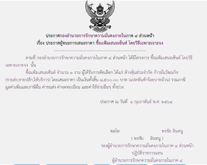 จัดซื้อ จัดจ้างประกาศผู้ชนะการเสนอราคา ประกาศผู้ชนะการเสนอราคา ซื้อแฟ้มเสนอเซ็นต์ โดยวิธีเฉพาะเจาะจง (8,500.00) February 7, 2021 1383 Share Facebook Twitter Google+ Telegram LINE สกบ.กอ.รมน.ภาค 4 สน.