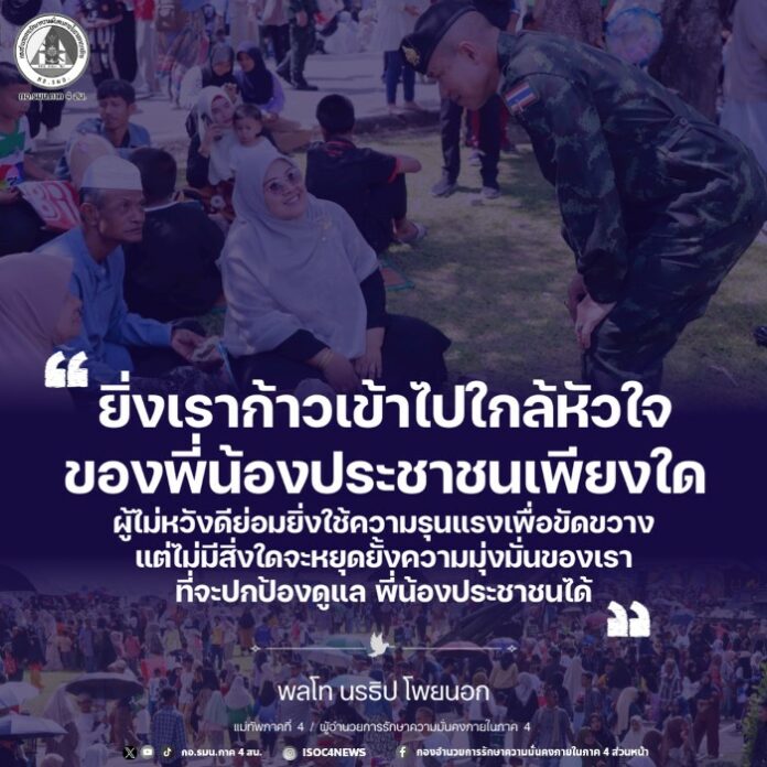 ประชาสัมพันธ์ข่าวประชาสัมพันธ์ “ยิ่งเราก้าวเข้าไปใกล้หัวใจของพี่น้องประชาชนเพียงใด ผู้ไม่หวังดีย่อมยิ่งใช้ความรุนแรงเพื่อขัดขวาง แต่ไม่มีสิ่งใดจะหยุดยั้งความมุ่งมั่นของเรา ที่จะปกป้องดูแล พี่น้องประชาชนได้” January 12, 2026 8 Share Facebook Twitter Google+ Telegram LINE “ยิ่งเราก้าวเข้าไปใกล้หัวใจของพี่น้องประชาชนเพียงใด ผู้ไม่หวังดีย่อมยิ่งใช้ความรุนแรงเพื่อขัดขวาง แต่ไม่มีสิ่งใดจะหยุดยั้งความมุ่งมั่นของเรา ที่จะปกป้องดูแล พี่น้องประชาชนได้” แม่ทัพภาคที่4 กองอำนวยการรักษาความมั่นคงภายในภาค4ส่วนหน้า