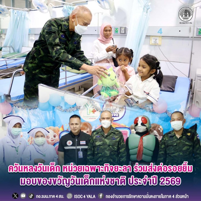 พลตรี อภินันท์ แจ่มแจ้ง ผู้บังคับหน่วยเฉพาะกิจยะลา จัดกิจกรรมมอบของขวัญเนื่องในวันเด็กแห่งชาติ ประจำปี 2569 ให้แก่เด็กและเยาวชนที่พักรักษาตัวอยู่ ณ โรงพยาบาลยะลา เพื่อเป็นการสร้างขวัญและกำลังใจแก่เด็กและเยาวชน ตลอดจนเสริมสร้างความสัมพันธ์อันดีระหว่างหน่วยงานกับประชาชนในพื้นที่