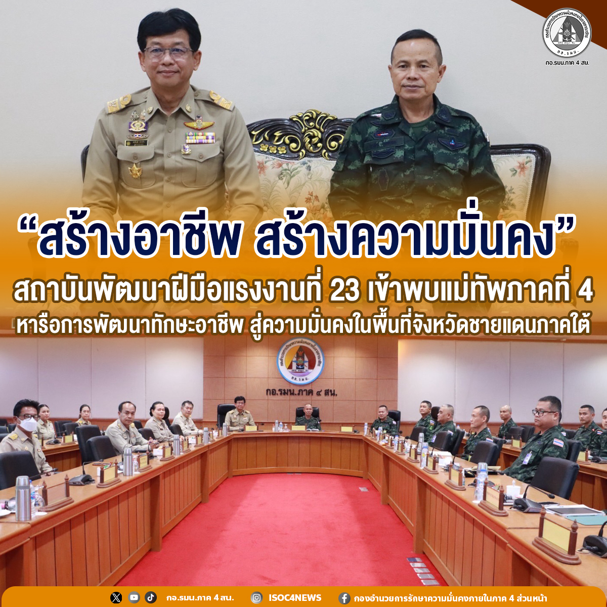 วันนี้ (12 มกราคม 2569) เวลา 13.25 น. ณ ห้องรับรอง กองอำนวยการรักษาความมั่นคงภายในภาค 4 ส่วนหน้า พลโท นรธิป โพยนอก แม่ทัพภาคที่ 4 / ผู้อำนวยการรักษาความมั่นคงภายในภาค 4 พร้อมด้วย พลตรี กรกฎ ภู่โชติ รองแม่ทัพภาคที่ 4 / รองผู้อำนวยการรักษาความมั่นคงภายในภาค 4 ส่วนหน้า, พันเอก กฤศณัฏฐ์ จันทร หัวหน้าสำนักงานเลขานุการ ศูนย์อำนวยการป้องกันและปราบปรามยาเสพติดจังหวัดชายแดนภาคใต้ และคณะผู้บังคับบัญชา ร่วมให้การต้อนรับคณะผู้บริหารจากกรมพัฒนาฝีมือแรงงาน กระทรวงแรงงาน โดยมี นายชาติวุฒิ ทองกัน ผู้ตรวจราชการกรมพัฒนาฝีมือแรงงาน พร้อมด้วยผู้อำนวยการสถาบันพัฒนาฝีมือแรงงานจาก 3 จังหวัดชายแดนภาคใต้ ในโอกาสเข้าพบเพื่ออวยพรเนื่องในวาระขึ้นปีใหม่