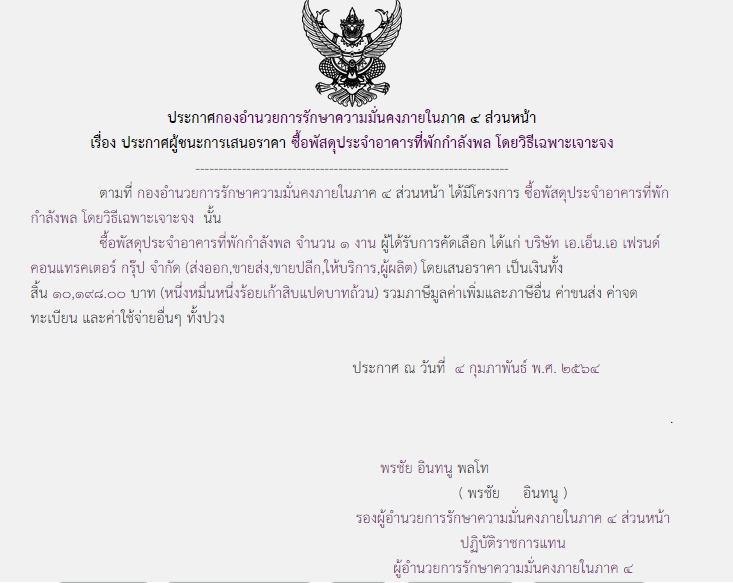 จัดซื้อ จัดจ้างประกาศผู้ชนะการเสนอราคา ประกาศผู้ชนะการเสนอราคา ซื้อพัสดุประจำอาคารที่พักกำลังพล โดยวิธีเฉพาะเจาะจง (10,198.00) February 7, 2021 828 Share Facebook Twitter Google+ Telegram LINE สกบ.กอ.รมน.ภาค 4 สน.