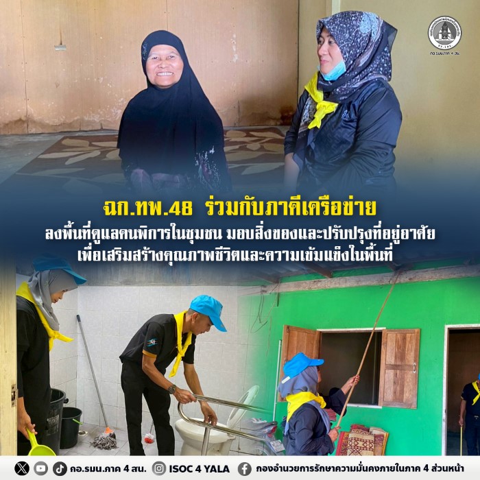 เมื่อวันที่ 12 มกราคม 2569 หน่วยเฉพาะกิจกรมทหารพรานที่ 48 โดย กองร้อยทหารพรานที่ 4807 นำกำลังพลชุดจิตอาสา ร่วมกับ เจ้าหน้าที่โรงพยาบาลส่งเสริมสุขภาพตำบลกาวะ, อาสาสมัครสาธารณสุขประจำหมู่บ้าน (อสม.) และประชาชนจิตอาสาในพื้นที่ ลงพื้นที่บ้านเป๊าะเจ๊ะเต็ง หมู่ที่ 1 ตำบลกาวะ อำเภอสุไหงปาดี จังหวัดนราธิวาส เพื่อพบปะเยี่ยมเยียน นางสาวปาตีเมาะ หะยียูโซ๊ะ ซึ่งเป็นผู้พิการทางการเคลื่อนไหว เพื่อให้การช่วยเหลือและบรรเทาความเดือดร้อนในเบื้องต้น