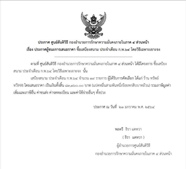 ประกาศผู้ชนะการเสนอราคา ซื้อเสบียงสนาม ประจำเดือน ก.พ.๖๔ โดยวิธีเฉพาะเจาะจง (83,160.00)
