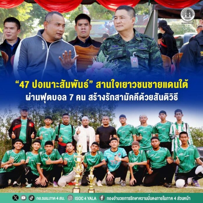 เมื่อวันที่ 13 มกราคม 2569 หน่วยเฉพาะกิจกรมทหารพรานที่ 47 จัดกิจกรรม “47 ปอเนาะสัมพันธ์” การแข่งขันกีฬาฟุตบอล 7 คน ภายใต้แนวคิด “รักสามัคคี ด้วยสันติวิธี เพื่อความสงบสุข” เพื่อเสริมสร้างความสัมพันธ์อันดีระหว่างหน่วยงานภาครัฐ ผู้บริหารสถาบันปอเนาะ บุคลากรทางการศึกษา และเยาวชนในพื้นที่
