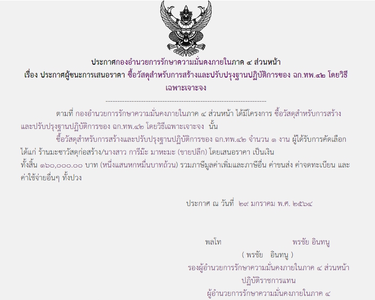 ประกาศผู้ชนะการเสนอราคา ซื้อวัสดุสำหรับและปรับปรุงฐานปฏิบัติการของ ฉก.ทพ.๔๒ โดยวิธีเฉพาะเจาะจง ( ๑๖๐,๐๐๐.๐๐ บาท )