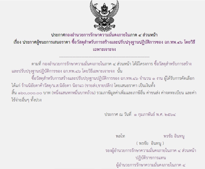 ประกาศผู้ชนะการเสนอราคา ซื้อวัสดุสำหรับการสร้างและปรับปรุงฐานปฏิบัติการของ ฉก.ทพ.๔๖ โดยวิธีเฉพาะเจาะจง ( ๑๖๐,๐๐๐.๐๐ บาท )