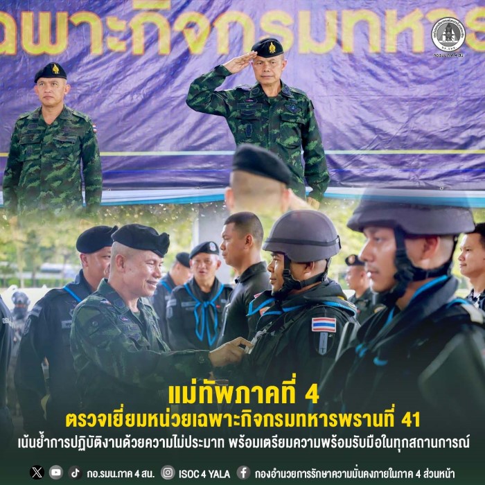 วันนี้ (15 มกราคม 2569) เวลา 10.30 น. พลโท นรธิป โพยนอก แม่ทัพภาคที่ 4 / ผู้อำนวยการรักษาความมั่นคงภายในภาค 4 และคณะผู้บังคับบัญชา ลงพื้นที่ตรวจเยี่ยมหน่วยเฉพาะกิจกรมทหารพรานที่ 41 ตำบลวังพญา อำเภอรามัน จังหวัดยะลา เพื่อรับฟังผลการปฏิบัติงาน พร้อมมอบนโยบายแก่เจ้าหน้าที่ให้มีการปรับแผนมาตรการรักษาความปลอดภัย เพื่อป้องกันการก่อเหตุความรุนแรงในพื้นที่รับผิดชอบ โดยมี พลตรี อภินันท์ แจ่มแจ้ง ผู้บังคับหน่วยเฉพาะกิจยะลา, พันเอก จตุพร ธานีพัฒน์ ผู้บังคับหน่วยเฉพาะกิจกรมทหารพรานที่ 41, ผู้บังคับกองร้อย และกำลังพลร่วมให้การต้อนรับ