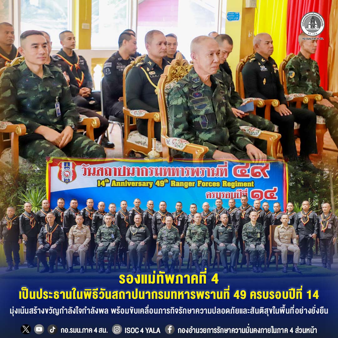 วันนี้ (15 มกราคม 2569) ณ ฐานปฏิบัติการกรมทหารพรานที่ 49 วัดสุคิรินประชาราม ตำบลสุคิริน อำเภอสุคิริน จังหวัดนราธิวาส พลตรี กรกฎ ภู่โชติ รองแม่ทัพภาคที่ 4 / รองผู้อำนวยการรักษาความมั่นคงภายในภาค 4 ส่วนหน้า เดินทางเป็นประธานในพิธีเนื่องในวันสถาปนากรมทหารพรานที่ 49 ครบรอบปีที่ 14 โดยมี พันเอก ณัฏฐพล สุนทรนนท์ ผู้บังคับการกรมทหารพรานที่ 49 พร้อมด้วยผู้บังคับบัญชา หัวหน้าส่วนราชการ ผู้นำท้องถิ่น และกำลังพลร่วมให้การต้อนรับอย่างพร้อมเพรียง