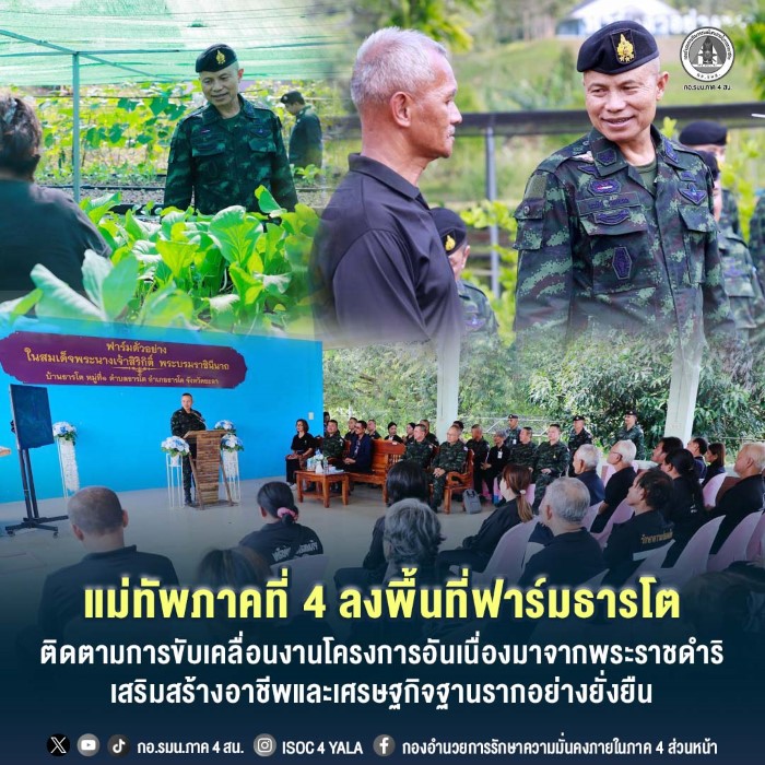วันนี้ (15 มกราคม 2569) เวลา 13.40 น. ณ ฟาร์มตัวอย่างในสมเด็จพระนางเจ้าสิริกิติ์ พระบรมราชินีนาถ บ้านธารโต ตำบลธารโต อำเภอธารโต จังหวัดยะลา พลโท นรธิป โพยนอก แม่ทัพภาคที่ 4 / ผู้อำนวยการรักษาความมั่นคงภายในภาค 4 ลงพื้นที่พบปะเครือข่ายมวลชน ตรวจเยี่ยมหน่วย และติดตามการขับเคลื่อนงานของฟาร์มตัวอย่างฯ เพื่อรับทราบผลการดำเนินงาน รับฟังปัญหา อุปสรรค และข้อเสนอแนะจากผู้ปฏิบัติงานและประชาชนในพื้นที่อย่างใกล้ชิด โดยมี พลตรี ณรงค์ ตันติสิทธิพร ผู้บัญชาการกองพลทหารราบที่ 15 / ผู้อำนวยการศูนย์ประสานงานโครงการอันเนื่องมาจากพระราชดำริ พร้อมด้วยผู้บังคับบัญชา หัวหน้าส่วนราชการ และเจ้าหน้าที่ที่เกี่ยวข้อง ร่วมให้การต้อนรับ