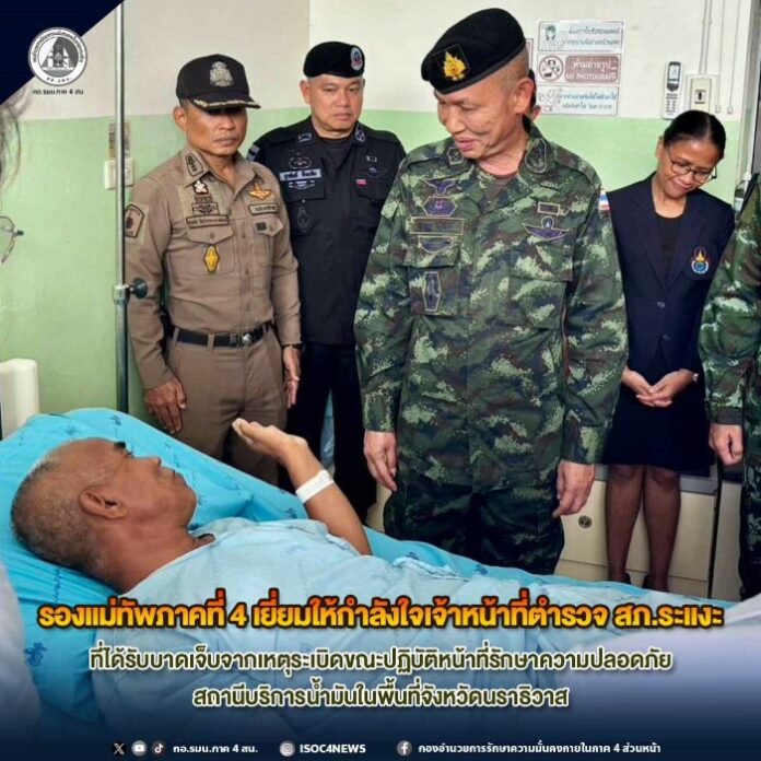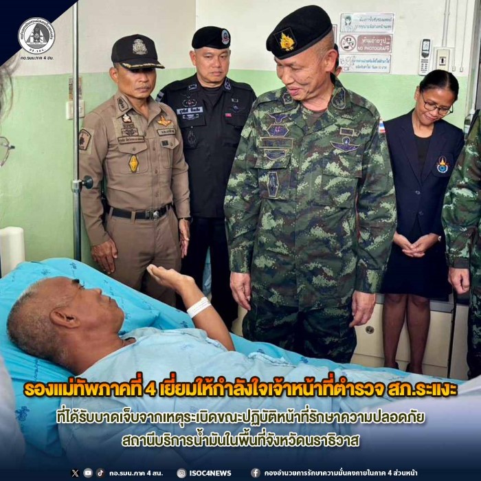เมื่อวันที่ 15 มกราคม 2569 พลตรี กรกฎ ภู่โชติ รองแม่ทัพภาคที่ 4 / รองผู้อำนวยการรักษาความมั่นคงภายในภาค 4 ส่วนหน้า เดินทางไปยังโรงพยาบาลนราธิวาสราชนครินทร์ อำเภอเมือง จังหวัดนราธิวาส เพื่อเยี่ยมอาการและมอบขวัญกำลังใจแก่ ร้อยตำรวจโท ประสิทธิ์ บำรุง รองสารวัตร ป้องกันปราบปราม สถานีตำรวจภูธรระแงะ ซึ่งได้รับบาดเจ็บจากเหตุการณ์ความรุนแรงในพื้นที่