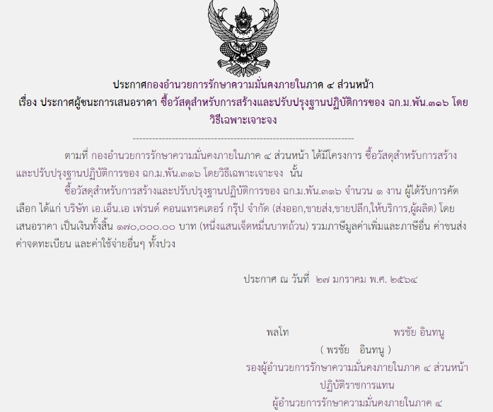ประกาศผู้ชนะการเสนอราคา ซื้อวัสดุสำหรับการสร้างและปรับปรุงฐานปฏิบัติการของ ฉก.ม.พัน.๓๑๖ โดยวิธีเฉพาะเจาะจง ( ๑๗๐,๐๐๐.๐๐ บาท )