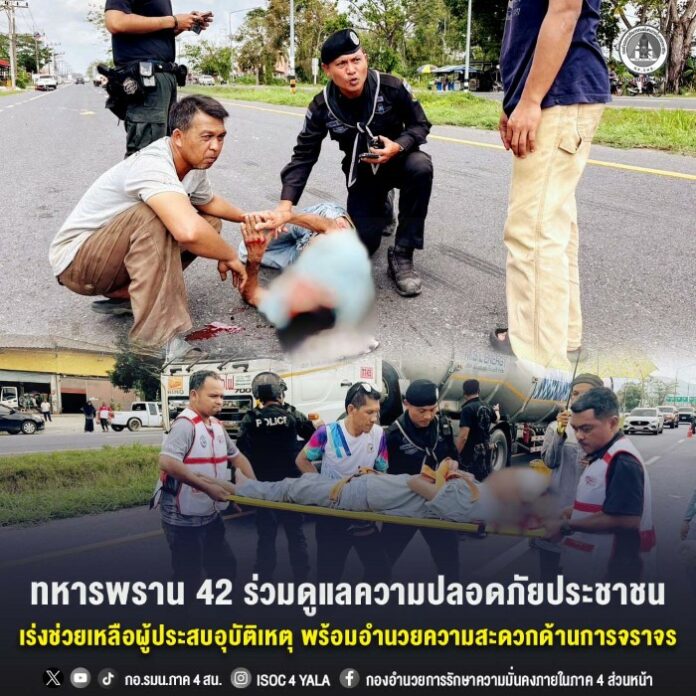 เมื่อวันที่ 15 มกราคม 2569 เวลา 10.20 น. หน่วยเฉพาะกิจกรมทหารพรานที่ 42 โดย ร้อยโท สุรเชษฐ ชะเมรัมย์ ผู้บังคับกองร้อยทหารพรานที่ 4213 พร้อมด้วยกำลังพลกองร้อยทหารพรานที่ 4213 เข้าช่วยเหลือประชาชนที่ประสบอุบัติเหตุรถจักรยานยนต์เฉี่ยวชนกับรถยนต์ บนถนนหมายเลข 42 ฝั่งมายอ บริเวณหน้าสถานีบริการน้ำมันเชลล์ บ้านปาลัส หมู่ที่ 5 ตำบลลางา อำเภอมายอ จังหวัดปัตตานี พร้อมทั้งอำนวยความสะดวกด้านการจราจร เพื่อป้องกันการเกิดอุบัติเหตุซ้ำซ้อนในพื้นที่