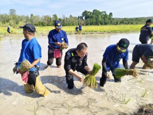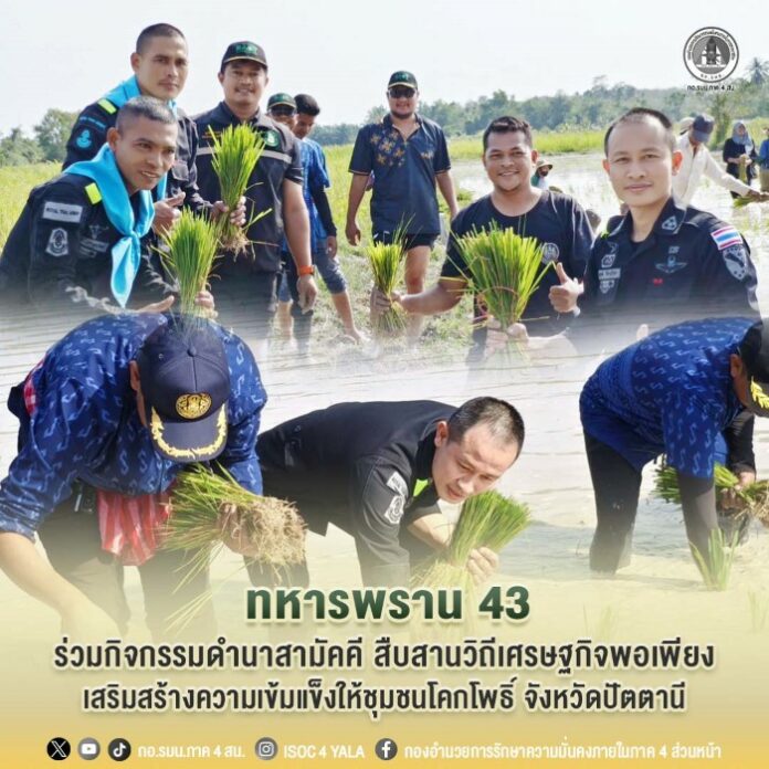 เมื่อวันที่ 16 มกราคม 2569 เวลา 09.00 น. หน่วยเฉพาะกิจกรมทหารพรานที่ 43 จัดกำลังพลชุดปฏิบัติการกิจการพลเรือน กองร้อยทหารพรานที่ 4315 บูรณาการความร่วมมือกับหน่วยงานภาครัฐ ผู้นำท้องที่ ผู้นำท้องถิ่น และประชาชนในพื้นที่ จัดกิจกรรม “ดำนาสามัคคีตามวิถีเศรษฐกิจพอเพียง” ณ แปลงนาสาธิตเกษตรผสมผสาน ศูนย์เรียนรู้โคกหนองนาอารยเกษตร หมู่ที่ 5 บ้านคลองช้าง ตำบลโคกโพธิ์ อำเภอโคกโพธิ์ จังหวัดปัตตานี เพื่อส่งเสริมให้ประชาชนได้เรียนรู้และสืบสานวิถีชีวิตชาวนาและภูมิปัญญาท้องถิ่น ควบคู่กับการน้อมนำหลักปรัชญาเศรษฐกิจพอเพียงมาประยุกต์ใช้ในชีวิตประจำวัน โดยมี นายเชาวลิตร สิทธิฤทธิ์นายอำเภอโคกโพธิ์/ผู้อำนวยการศูนย์ปฏิบัติการอำเภอ เป็นประธานในพิธี