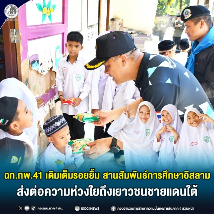 วันที่ 17 มกราคม 2569 เวลา 11.00 น. พันเอก จตุพร ธานีพัฒน์ ผู้บังคับหน่วยเฉพาะกิจกรมทหารพรานที่ 41 ลงพื้นที่พบปะเยี่ยมเยียน สานสัมพันธ์กับคณะครูผู้สอนศาสนาและเด็กนักเรียน ณ ศูนย์การศึกษาอิสลามประจำมัสยิด (ตาดีกา) นะห์ฎอตุลอิสลามียะห์ บ้านปูลามอง หมู่ที่ 6 ตำบลเกะรอ อำเภอรามัน จังหวัดยะลา
