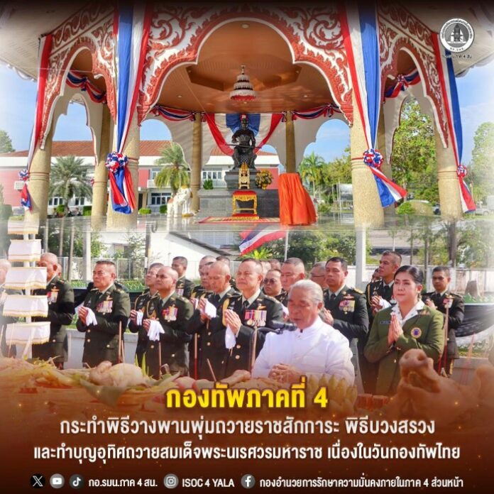 วันที่ 18 มกราคม 2569 เวลา 09.00 น. ณ บริเวณศาลสมเด็จพระนเรศวรมหาราช หน้ากองบัญชาการกองทัพภาคที่ 4 ค่ายวชิราวุธ อำเภอเมือง จังหวัดนครศรีธรรมราช กองทัพภาคที่ 4 จัดพิธีวางพานพุ่มถวายถวายราชสักการะ และพิธีบวงสรวง พระบรมรูปสมเด็จพระนเรศวรมหาราช เนื่องในวันกองทัพบก (วันกองทัพไทย) ประจำปี 2569 โดยมี พลโท นรธิป โพยนอก แม่ทัพภาคที่ 4 เป็นประธานในพิธี พร้อมด้วย พันโทหญิง ปาริชาติ โพยนอก ประธานสมาคมแม่บ้านทหารบก สาขากองทัพภาคที่ 4 นายทหารชั้นผู้ใหญ่ ผู้บังคับหน่วยภายในค่ายวชิราวุธ ข้าราชการทหาร ตลอดจนคณะแม่บ้านทหารบก สาขากองทัพภาคที่ 4 เข้าร่วมพิธีอย่างพร้อมเพรียง