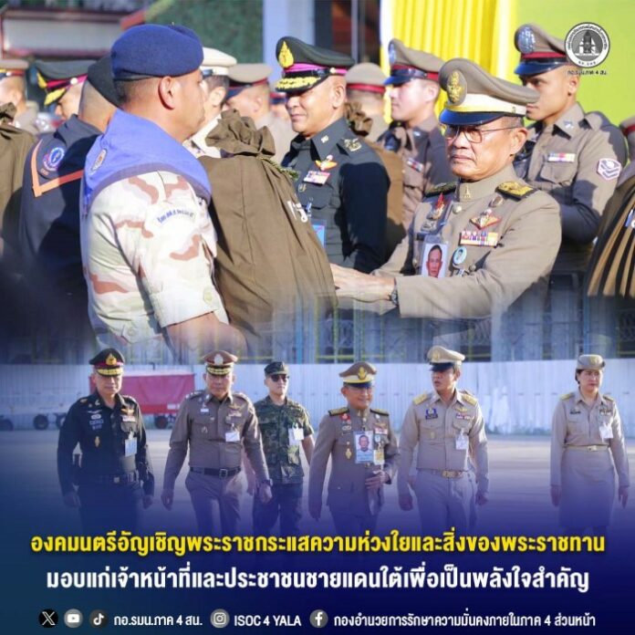 การเชิญสิ่งของพระราชทาน ณ จังหวัดนราธิวาส ในช่วงเช้า พลเอก ไพบูลย์ คุ้มฉายา องคมนตรี ได้เดินทางไปยังสถานีตำรวจภูธรยี่งอ อำเภอยี่งอ จังหวัดนราธิวาส เพื่อเชิญสิ่งของพระราชทานจำนวน 75 ชุด มอบแก่เจ้าหน้าที่ที่ปฏิบัติภารกิจและได้รับผลกระทบจากเหตุการณ์เมื่อวันที่ 7 กันยายน 2568, 16 ตุลาคม 2568 และ 19 ธันวาคม 2568 ที่ผ่านมา โดยมีผู้ว่าราชการจังหวัดนราธิวาสให้การต้อนรับ และแม่ทัพภาคที่ 4 กล่าวสำนึกในพระมหากรุณาธิคุณ