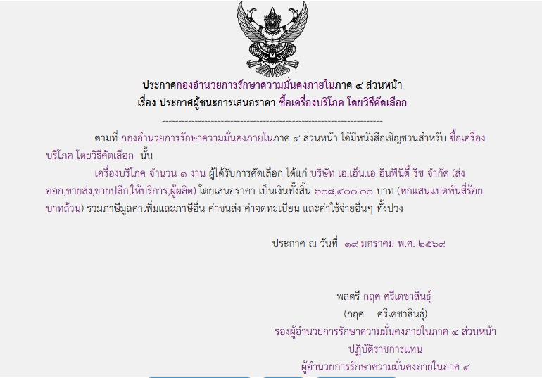 จัดซื้อ จัดจ้างประกาศผู้ชนะการเสนอราคา ประกาศ กองอำนวยการรักษาความมั่นคงภายในภาค ๔ ส่วนหน้า เรื่อง ประกาศผู้ชนะการเสนอราคา ซื้อเครื่องบริโภค โดยวิธีคัดเลือก January 20, 2026 7 Share Facebook Twitter Google+ Telegram LINE