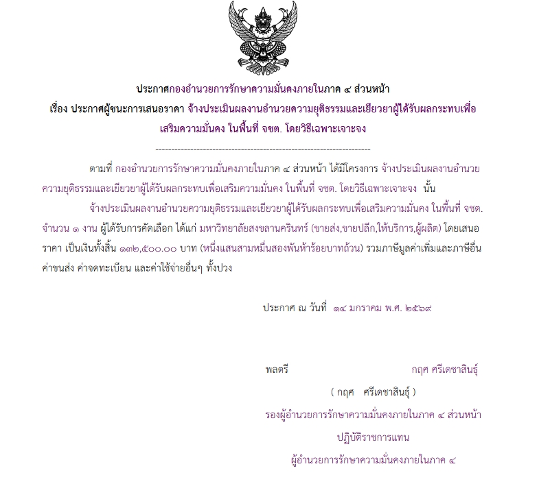ประกาศ กองอำนวยการรักษาความมั่นคงภายในภาค ๔ ส่วนหน้า เรื่อง ประกาศผู้ชนะการเสนอราคา จ้างการประเมินผลงานอำนวยความยุติธรรมและเยียวยาผู้ได้รับผลกระทบเพื่อเสริมสร้างความมั่นคง ในพื้นที่ จชต. โดยวิธีเฉพาะเจาะจง