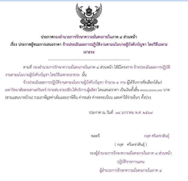 จัดซื้อ จัดจ้างประกาศผู้ชนะการเสนอราคา ประกาศ กองอำนวยการรักษาความมั่นคงภายในภาค ๔ ส่วนหน้า เรื่อง ประกาศผู้ชนะการเสนอราคา จ้างการประเมินผลการปฏิบัติงานตามนโยบายผู้บังคับบัญชา โดยวิธีเฉพาะเจาะจง January 20, 2026 4 Share Facebook Twitter Google+ Telegram LINE