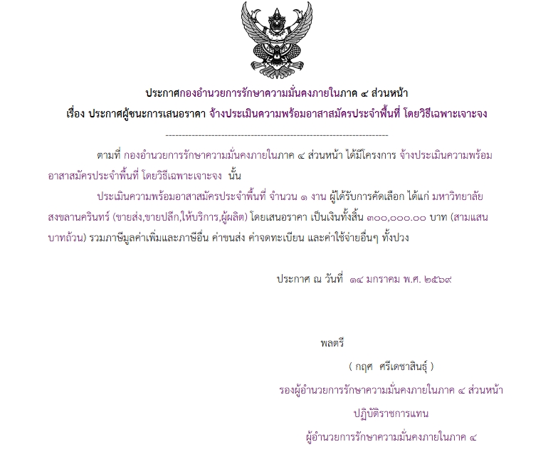จัดซื้อ จัดจ้างประกาศผู้ชนะการเสนอราคา ประกาศ กองอำนวยการรักษาความมั่นคงภายในภาค ๔ ส่วนหน้า เรื่อง ประกาศผู้ชนะการเสนอราคา จ้างการประเมินความพร้อมอาสาสมัครประจำพื้นที่ โดยวิธีเฉพาะเจาะจง January 20, 2026 4 Share Facebook Twitter Google+ Telegram LINE