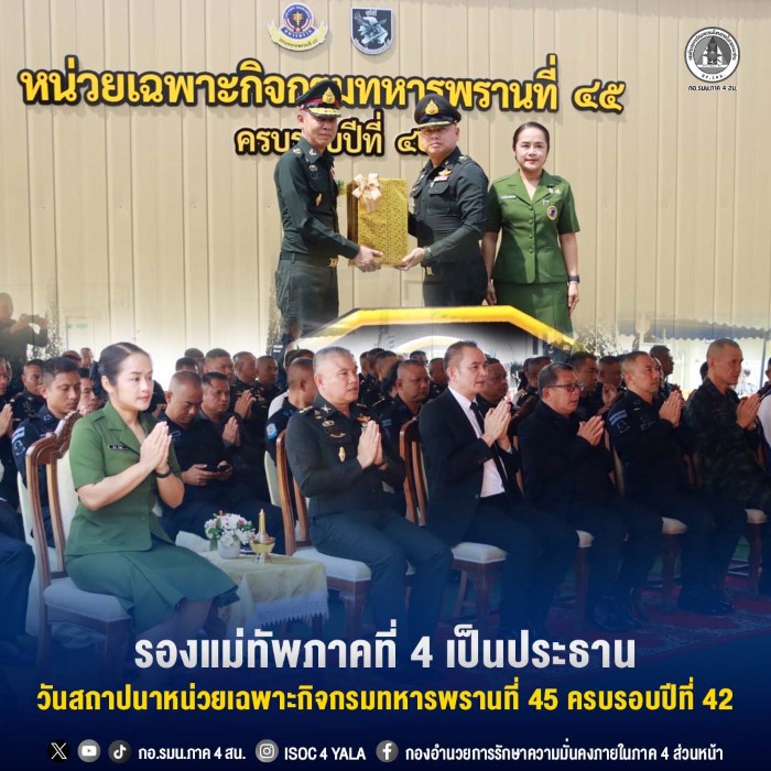วันนี้ (21 มกราคม 2569) เวลา 10.30 น. ณ กองบังคับการหน่วยเฉพาะกิจกรมทหารพรานที่ 45 พลตรี กรกฎ ภู่โชติ รองแม่ทัพภาคที่ 4 / รองผู้อำนวยการรักษาความมั่นคงภายในภาค 4 ส่วนหน้า เป็นประธานในพิธีวันสถาปนาหน่วยเฉพาะกิจกรมทหารพรานที่ 45 ครบรอบปีที่ 42 เพื่อรำลึกถึงภารกิจ หน้าที่ และความเสียสละของกำลังพลที่ได้ปฏิบัติหน้าที่ด้วยความมุ่งมั่นในการดูแลความสงบเรียบร้อยและความมั่นคงในพื้นที่มาอย่างต่อเนื่อง โดยมี พันเอก สุรศักดิ์ พึ่งแย้ม ผู้บังคับหน่วยเฉพาะกิจกรมทหารพรานที่ 45, คณะผู้บังคับบัญชาหน่วยขึ้นตรง และหน่วยงานในพื้นที่ใกล้เคียง ตลอดจนกำลังพลเข้าร่วมพิธีโดยพร้อมเพรียง