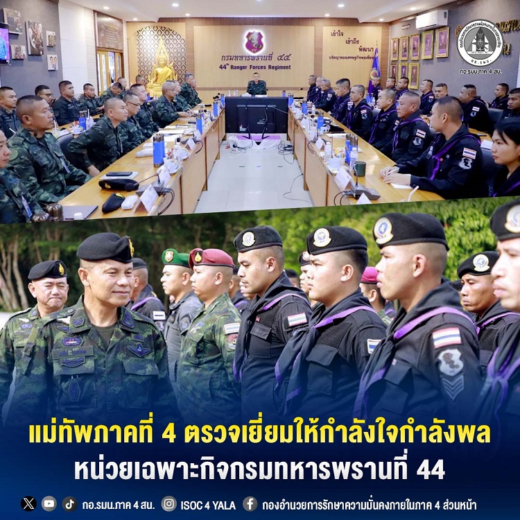 เมื่อวันที่ 21 มกราคม 2569 เวลา 13.00 น. พลโท นรธิป โพยนอก แม่ทัพภาคที่ 4 / ผู้อำนวยการรักษาความมั่นคงภายในภาค 4 ได้เดินทางตรวจเยี่ยมและให้กำลังใจกำลังพล หน่วยเฉพาะกิจกรมทหารพรานที่ 44 พร้อมรับฟังการบรรยายสรุปผลการปฏิบัติงาน และติดตามสถานการณ์ด้านความมั่นคงในพื้นที่รับผิดชอบของหน่วย ณ กองบังคับการหน่วยเฉพาะกิจกรมทหารพรานที่ 44 ตำบลปะเสยะวอ อำเภอสายบุรี จังหวัดปัตตานี