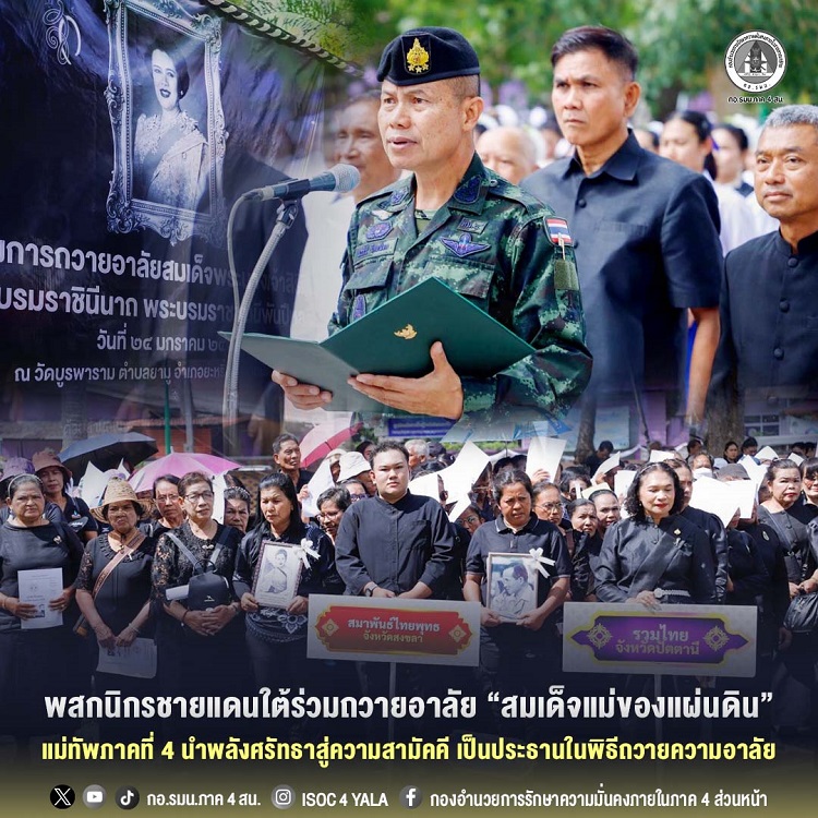 วันนี้ (24 มกราคม 2569) เวลา 11.00 น. ที่ วัดบูรพาราม ตำบลยามู อำเภอยะหริ่ง จังหวัดปัตตานี พลโท นรธิป โพยนอก แม่ทัพภาคที่ 4 / ผู้อำนวยการรักษาความมั่นคงภายในภาค 4 เป็นประธานในพิธีถวายความอาลัย สมเด็จพระนางเจ้าสิริกิติ์ พระบรมราชินีนาถ พระบรมราชชนนีพันปีหลวง ซึ่งจัดโดยสมาพันธ์ไทยพุทธจังหวัดชายแดนภาคใต้ โดยมี พลตรี กรกฎ ภู่โชติ รองแม่ทัพภาคที่ 4 / รองผู้อำนวยการรักษาความมั่นคงภายในภาค 4 ส่วนหน้า, พลเอก มณี จันทร์ทิพย์ ที่ปรึกษากองอำนวยการรักษาความมั่นคงภายในภาค 4 ส่วนหน้า / เลขาธิการศูนย์พัฒนาและส่งเสริมพระพุทธศาสนาจังหวัดชายแดนภาคใต้ / นายกสมาคมเพื่อความมั่นคงพระพุทธศาสนาจังหวัดชายแดนภาคใต้, นายพงศ์ศักดิ์ พรหมสังข์ ประธานสมาพันธ์ไทยพุทธจังหวัดชายแดนภาคใต้, นายสนั่น สนธิเมือง รองผู้ว่าราชการจังหวัดปัตตานี พร้อมด้วยพี่น้องประชาชน, เยาวชนในพื้นที่ และขบวนนางรำ เข้าร่วมในพิธีกว่า 1,000 คน