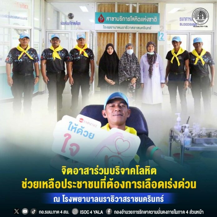 การบริจาคโลหิตในครั้งนี้ เพื่อช่วยเหลือ นางสาวนุรยีฮะห์ สะแลแม ประชาชนหมู่ที่ 13 ตำบลบูกิต อำเภอเจาะไอร้อง จังหวัดนราธิวาส ซึ่งประสบอุบัติเหตุทางรถยนต์ ต้องเข้ารับการผ่าตัดในช่องท้อง และมีภาวะโลหิตจาง จำเป็นต้องใช้โลหิตเพื่อการรักษาเป็นการเร่งด่วน โดยมีความต้องการโลหิตรวมจำนวน 2,250 มิลลิลิตร