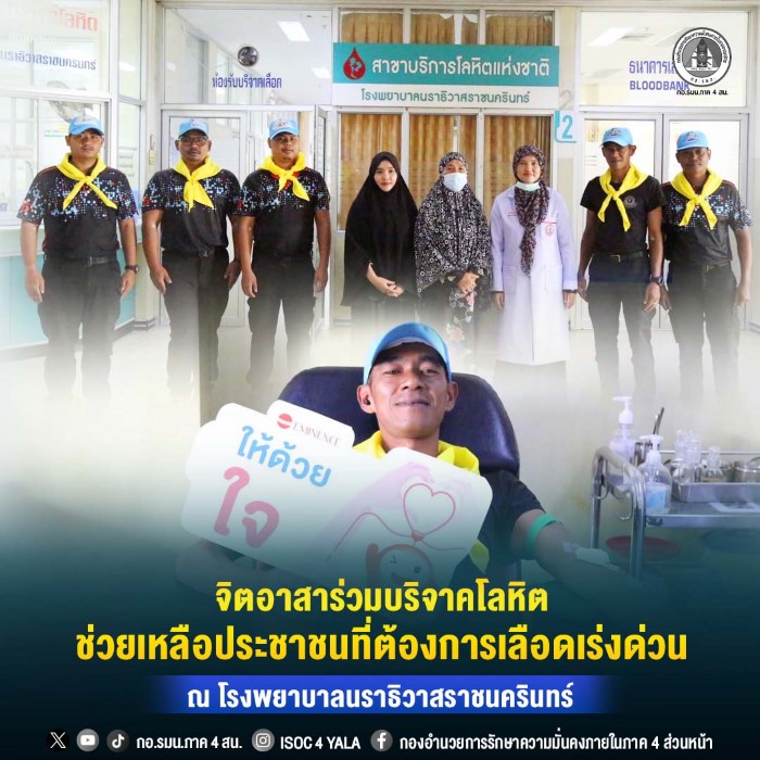 พันเอก นพดล พรหมมาก ผู้บังคับหน่วยเฉพาะกิจกรมทหารพรานที่ 46 มอบหมายให้เจ้าหน้าที่ฝ่ายกิจการพลเรือน พร้อมด้วยกำลังพลจิตอาสาของหน่วย เข้าร่วมบริจาคโลหิตเพื่อช่วยเหลือผู้ป่วยที่ต้องการเลือดอย่างเร่งด่วน ณ โรงพยาบาลนราธิวาสราชนครินทร์ อำเภอเมืองนราธิวาส จังหวัดนราธิวาส