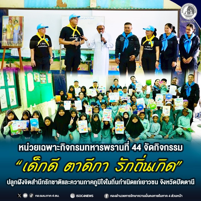 หน่วยเฉพาะกิจกรมทหารพรานที่ 44 โดย ร้อยเอก โกวิท อนุการ ผู้บังคับกองร้อยทหารพรานที่ 4407 พร้อมด้วย ผู้บังคับหมวดทหารพรานหญิง, กำลังพลจิตอาสาพระราชทาน 904 และชุดปฏิบัติการกิจการพลเรือน ลงพื้นที่จัดกิจกรรม “เด็กดี ตาดีกา รักถิ่นเกิด” ณ ศูนย์การศึกษาอิสลามประจำมัสยิด (ตาดีกา) มัสยิดนุรุดดีนียะห์ หมู่ที่ 4 บ้านป่าม่วง ตำบลมะนังดาลำ อำเภอสายบุรี จังหวัดปัตตานี