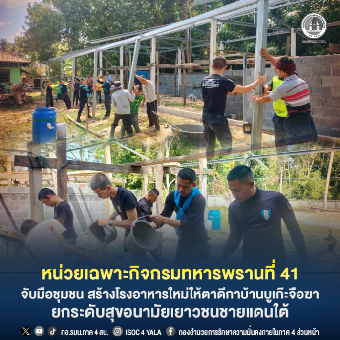 ยะลา (26 มกราคม 2569) – หน่วยเฉพาะกิจกรมทหารพรานที่ 41 นำกำลังพลชุดปฏิบัติการกิจการพลเรือน กองร้อยทหารพรานที่ 4113 บูรณาการความร่วมมือกับผู้นำศาสนา ผู้นำชุมชน และพี่น้องประชาชนในพื้นที่ ร่วมแรงร่วมใจก่อสร้างอาคารโรงอาหารให้แก่ ศูนย์การศึกษาอิสลามประจำมัสยิด (ตาดีกา) ยาแมะบูเก๊ะจือฆา หมู่ที่ 5 บ้านบูเก๊ะจือฆา ตำบลวังพญา อำเภอรามัน จังหวัดยะลา