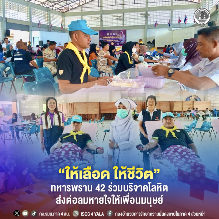หน่วยเฉพาะกิจกรมทหารพรานที่ 42 โดย ร้อยเอก เฉลิมพันธ์ บุญอินทร์ ผู้บังคับกองร้อยทหารพรานที่ 4211 นำกำลังพลจิตอาสา เข้าร่วมกิจกรรมบริจาคโลหิตให้กับเหล่ากาชาดจังหวัดปัตตานี ครั้งที่ 4/2569 ณ หอประชุมที่ว่าการอำเภอมายอ จังหวัดปัตตานี