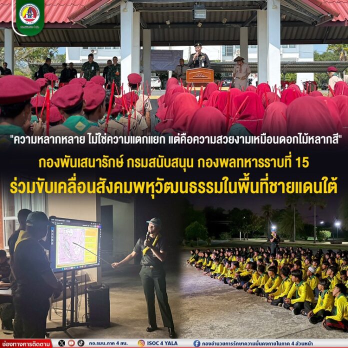 เมื่อวันที่ 27–28 มกราคม 2569 กองพันเสนารักษ์ กรมสนับสนุน กองพลทหารราบที่ 15 ได้ปฏิบัติภารกิจจิตอาสา ปลูกฝังอุดมการณ์สถาบันหลักของชาติ ภายใต้แนวคิด “พหุวัฒนธรรม ดอกไม้หลากสี ความหลากหลาย คือ ความสวยงาม” เพื่อส่งเสริมการยอมรับความแตกต่าง เคารพซึ่งกันและกัน และร่วมกันพัฒนาพื้นที่อย่างสร้างสรรค์ ตามแนวทางการขับเคลื่อนสังคมสันติสุข “SATU PADU”