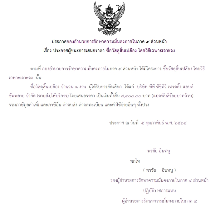 ประกาศผู้ชนะการเสนอราคา ซื้อวัสดุสิ้นเปลือง โดยวิธีเฉพาะเจาะจง ( ๘,๔๐๐.๐๐ บาท )