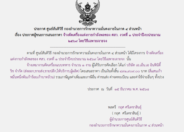 จัดซื้อ จัดจ้างประกาศผู้ชนะการเสนอราคา ประกาศผู้ชนะการเสนอราคา จ้างตัดเครื่องแต่งกายกำลังพลของ ศสว. งวดที่ ๑ ประจำปีงบประมาณ ๒๕๖๙ โดยวิธีเฉพาะเจาะจง January 29, 2026 27 Share Facebook Twitter Google+ Telegram LINE